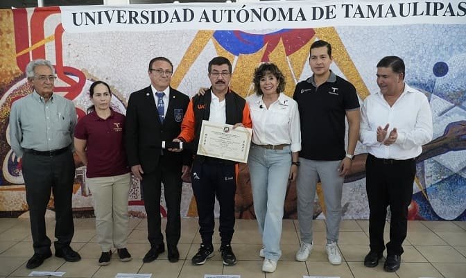 La entrega de esta distinción estuvo a cargo del Shihan Juan Gerardo Guerrero Ortiz, director de Grados y de Kata de la Federación Mexicana de Judo, en el marco de la eliminatoria de judo en su etapa “Estatal CONADE 2026” desarrollada en el Gimnasio Universitario del Campus Victoria, con la presencia de la secretaria de Bienestar Social de Tamaulipas, Silvia Casas González.